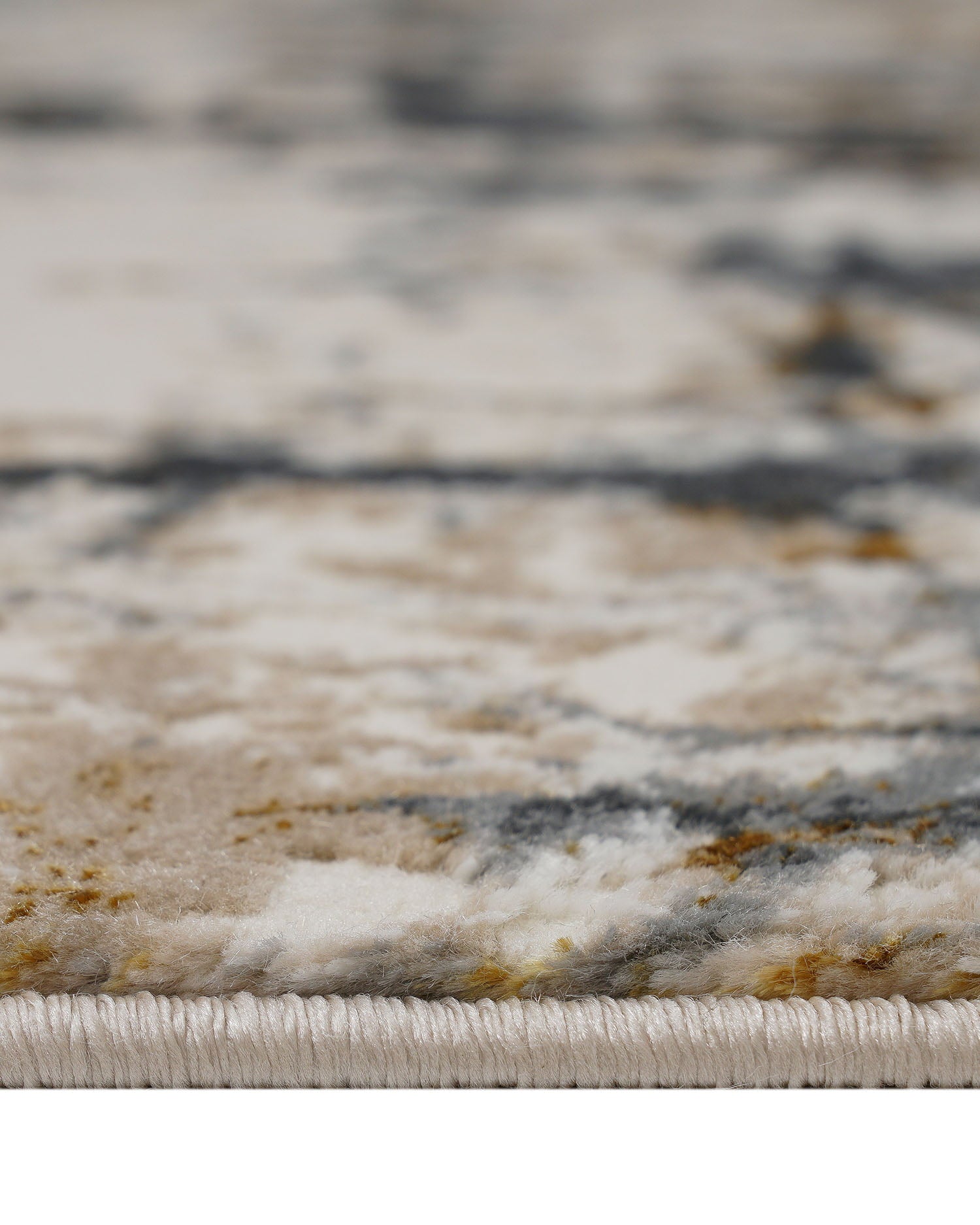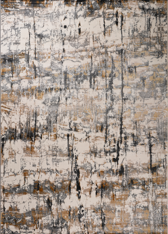 Los toques dorados, sutilmente entretejidos en el diseño, añaden un toque de lujo y sofisticación, con visos que capturan la luz y brindan un brillo suave. Su textura es densa y suave, ofreciendo una sensación de confort bajo los pies, mientras que la combinación de estos tonos le otorga una estética moderna y refinada. Perfecta para cualquier espacio, desde salas de estar hasta dormitorios o oficinas, esta alfombra es ideal para quienes buscan una pieza que complemente tanto decoraciones minimalistas como ambientes más elegantes.