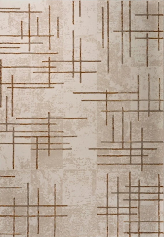 Una elegante alfombra en tonos grises y beige, con sutiles visos que capturan la luz, creando un juego de sombras que añaden profundidad y calidez al ambiente