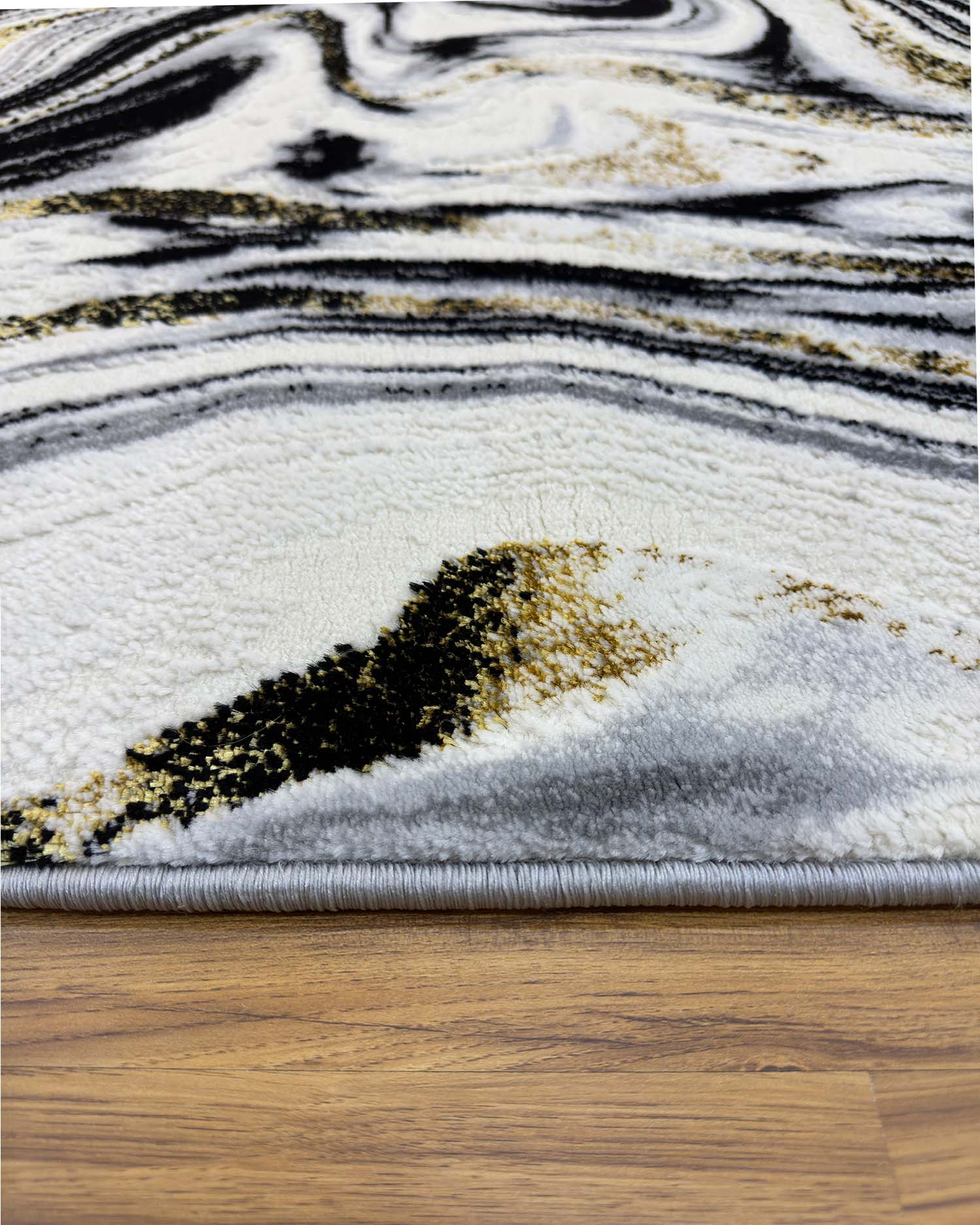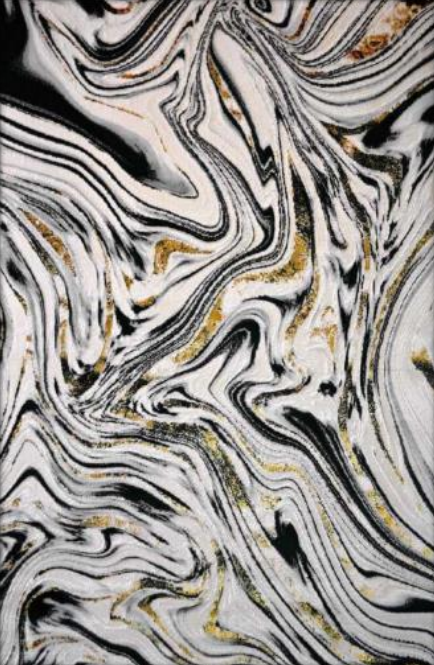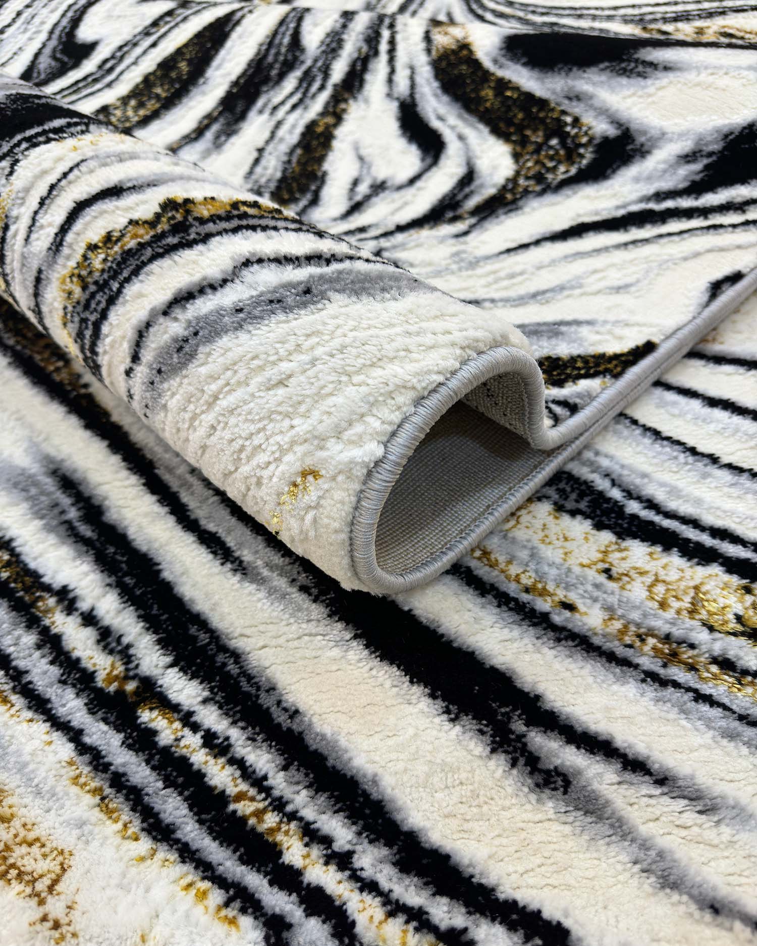 Esta alfombra turca tiene un diseño abstracto en tonos negros, dorados y blancos exclusivo, con medidas de 1.40x2.00 . Proporciona un toque elegante y moderno a cualquier espacio, además de ser duradera y de alta calidad. Perfecta para añadir estilo y calidez a tu hogar.