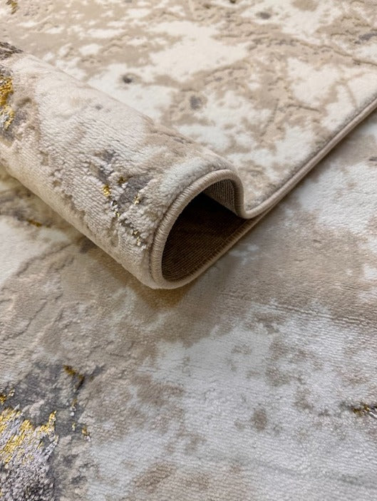 Elegante y funcional, este tapete turco en tonos dorado, blanco y gris es ideal para realzar tu casa. Su diseño sofisticado y su tamaño perfecto aportan calidez y estilo a cualquier sala.